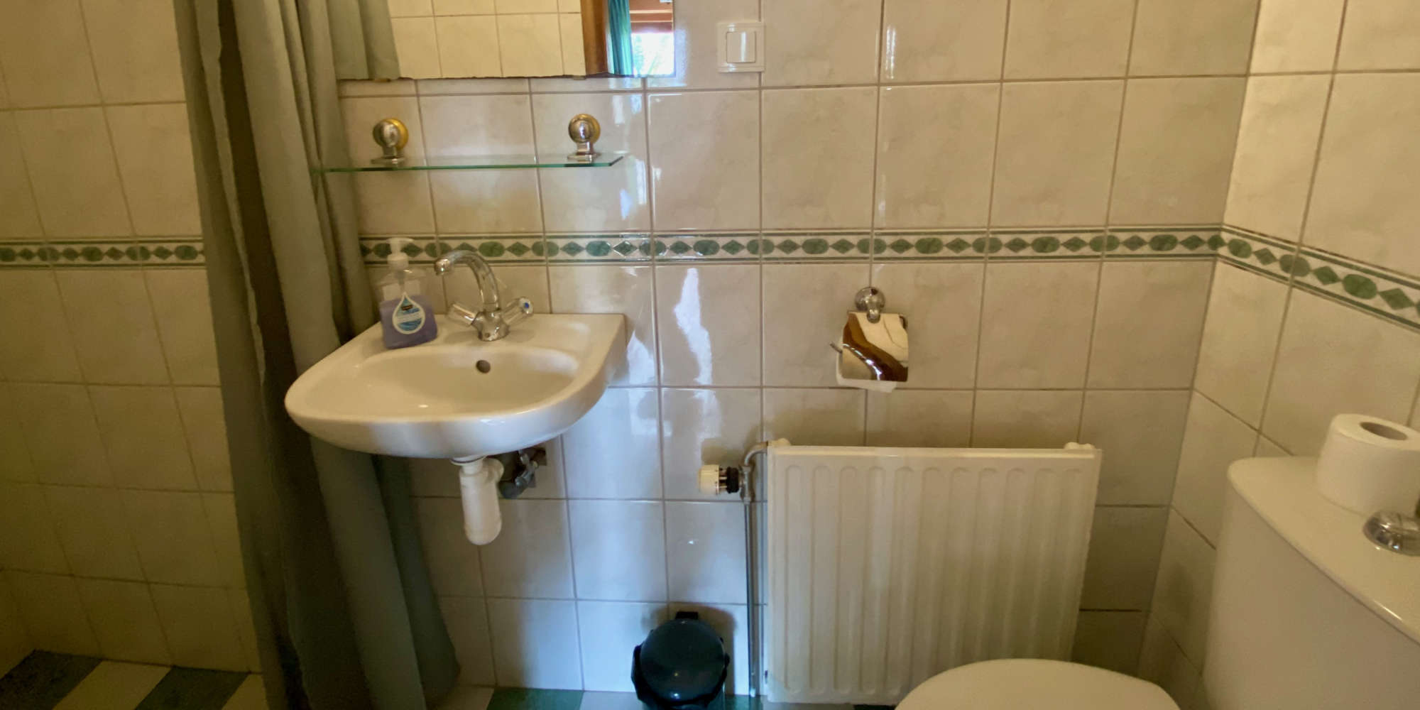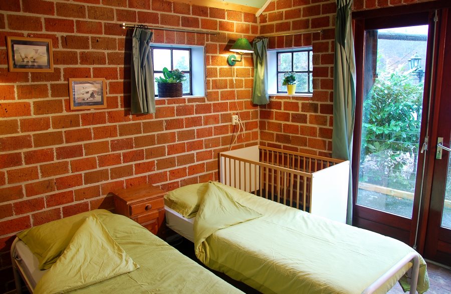 Slaapkamer 1: 2x éénpersoons bedden, 1 kinderledikantje + douche, wastafel en toilet.